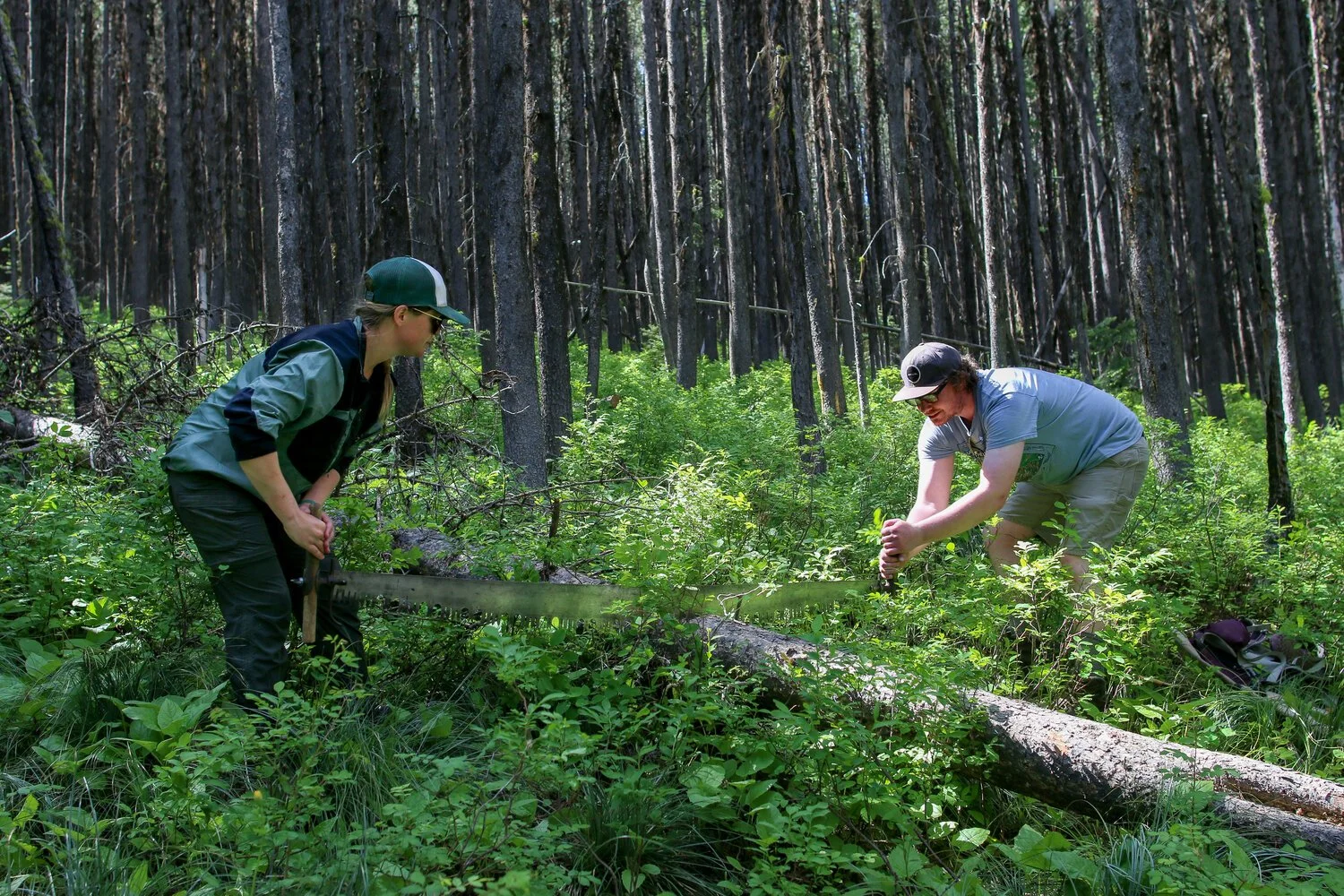 As we moseyed further beyond the wilderness boundary, the leaners (aka trees hanging over the trail, including full-on larch arches) and blockages on the trail increased both in number and in size. At each downed tree, Kaydee and Nathan or Si would unstrap the old firehose cover that protected the blades of the crosscut saw, screw on a handlebar, and get into position on either side of the log. After four seasons together, they work like a well-oiled machine, smoothly pulling the blade back and forth as if it’s slicing a loaf of bread.