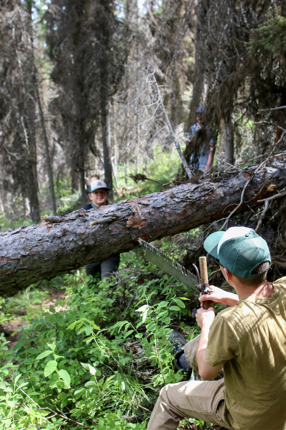 With only one of the four miles ahead being outside the wilderness boundary and motorized and mechanized equipment being banned beyond that boundary, it was decided that lugging the extra (and unreliable) equipment likely wasn’t worth it, so Nathan turned around and headed back to the Jeep to shed the unnecessary weight. Kaydee, Si, Tayberry and I pushed ahead with our backcountry arsenal of a two-man crosscut saw, silky saw, ax, and child-sized plastic rake; what first appeared as some kind of inside joke actually turned out to be an incredibly useful tool.
